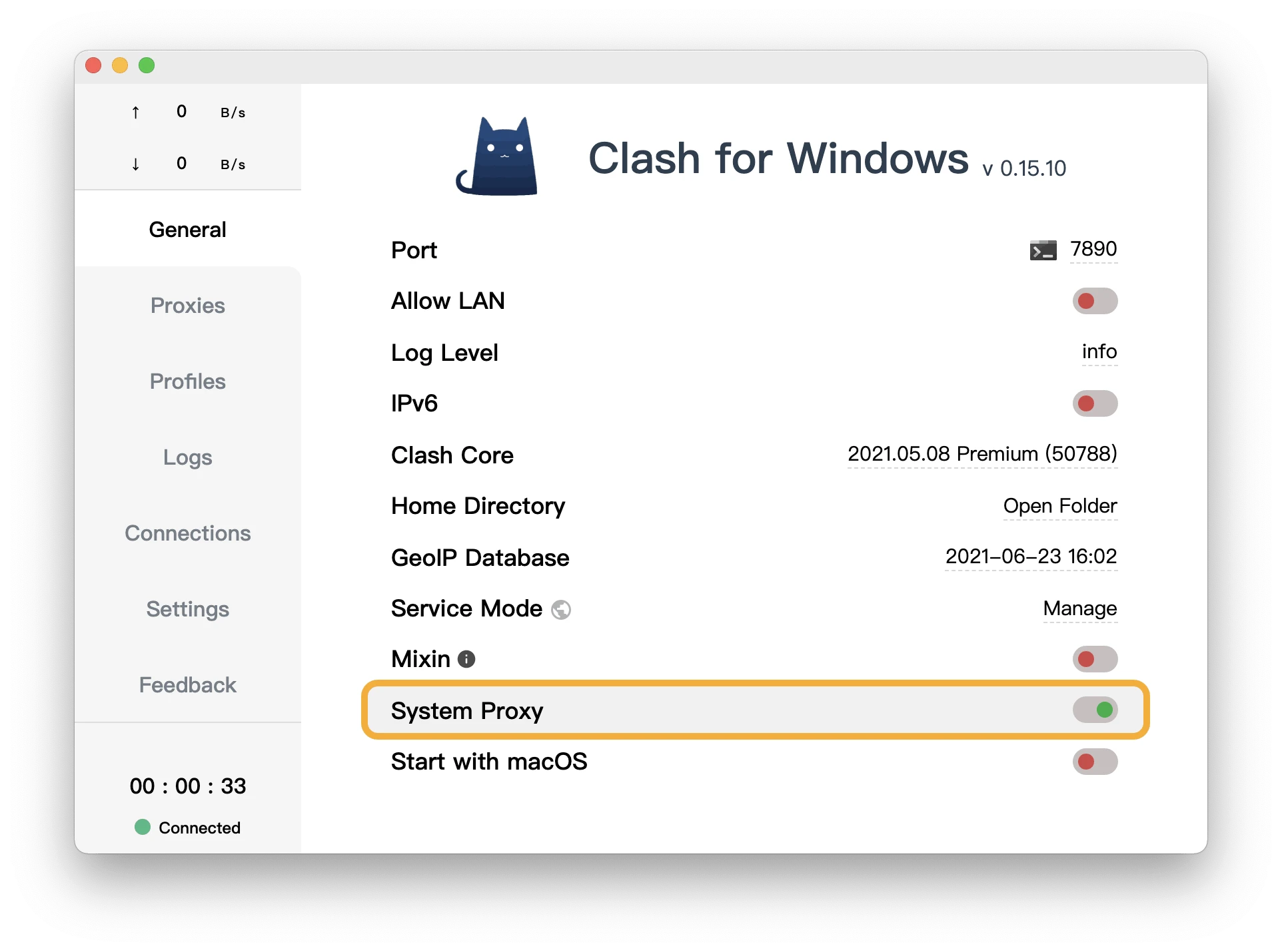 12. 点击左侧的 General (通用)。开启 System Proxy (系统代理),Clash for Winodws 便开始接管系统流量。