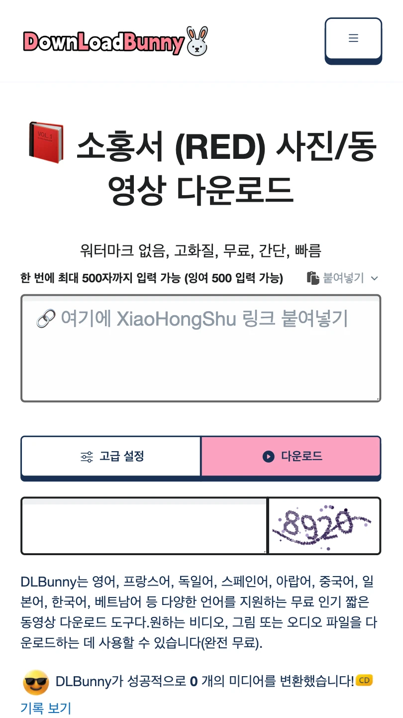 - DLBunny 다운로드 도구 열기: Safari/Chrome 등 브라우저에서 DLBunny.com/ko/xhs 사이트에 접속하세요.이 사이트는 레드북 링크를 처리해 워터마크 없는 HD 화질 미디어를 다운받게 해줍니다.