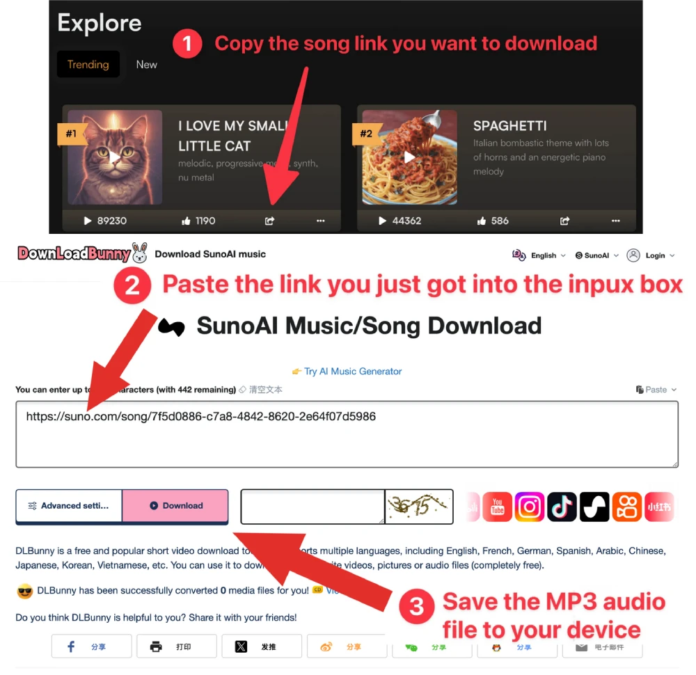 Cukup tempelkan tautan bagikan trek Suno yang ingin Anda unduh ke dalam bidang input. Klik tombol unduh untuk mendapatkan tautan unduhan. Setelah tautan unduhan siap, klik tombol unduh lagi untuk menyimpan trek ke perangkat Anda. Anda dapat menyalin tautan seperti yang ditunjukkan pada gambar.