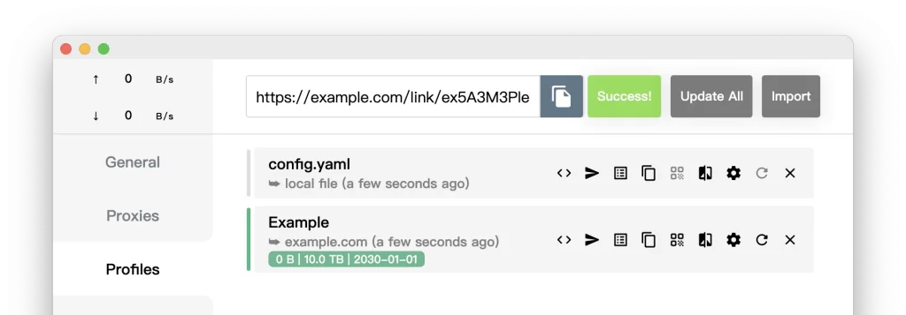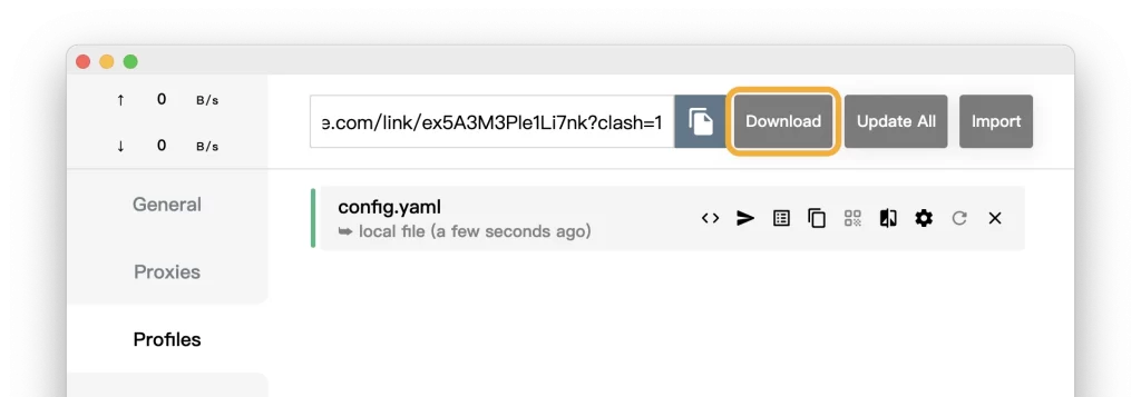 9.At the top of the Profiles page, paste the Clash configuration subscription link, and then click Download to download the configuration file.