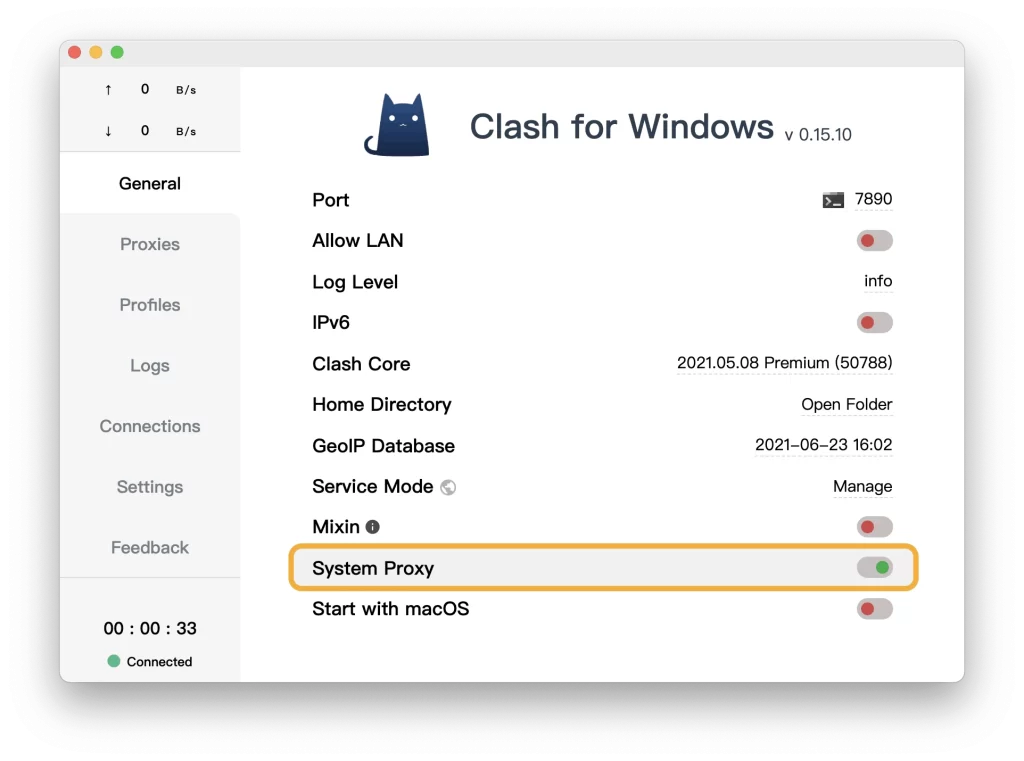 12.Click General on the left. Turn on System Proxy, and Clash for Windows will then start taking over the system traffic.