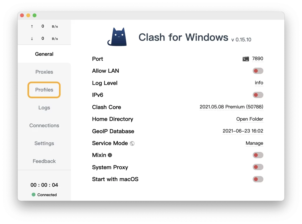 8.First, open Clash for Windows and click Profiles (configuration files) on the left side of the window.